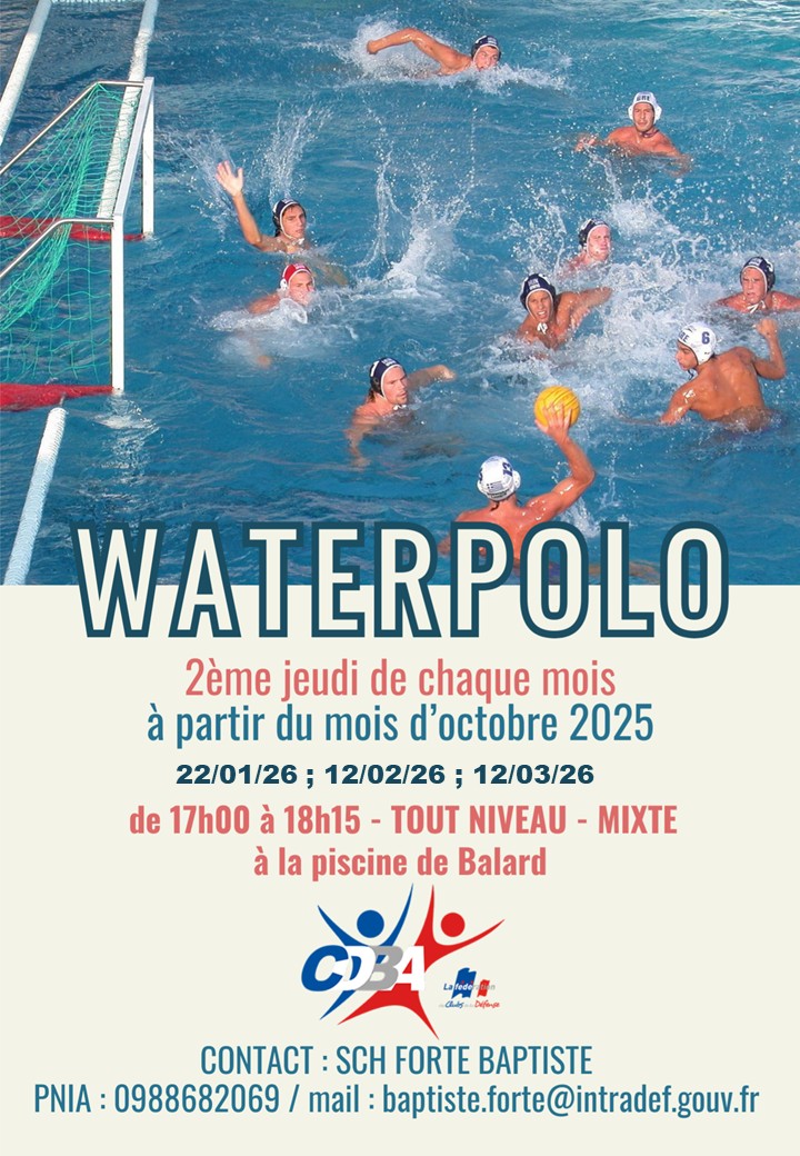 SGT Baptiste FORTE vous annonce l’ouverture de sessions de Waterpolo. Jeudi 22/01/26, 12/02/26/ ET 12/03/26 De 17h00 à 18h15 Tout niveau – mixte Ouvert aux militaires de BALARD et… Lire la suite →