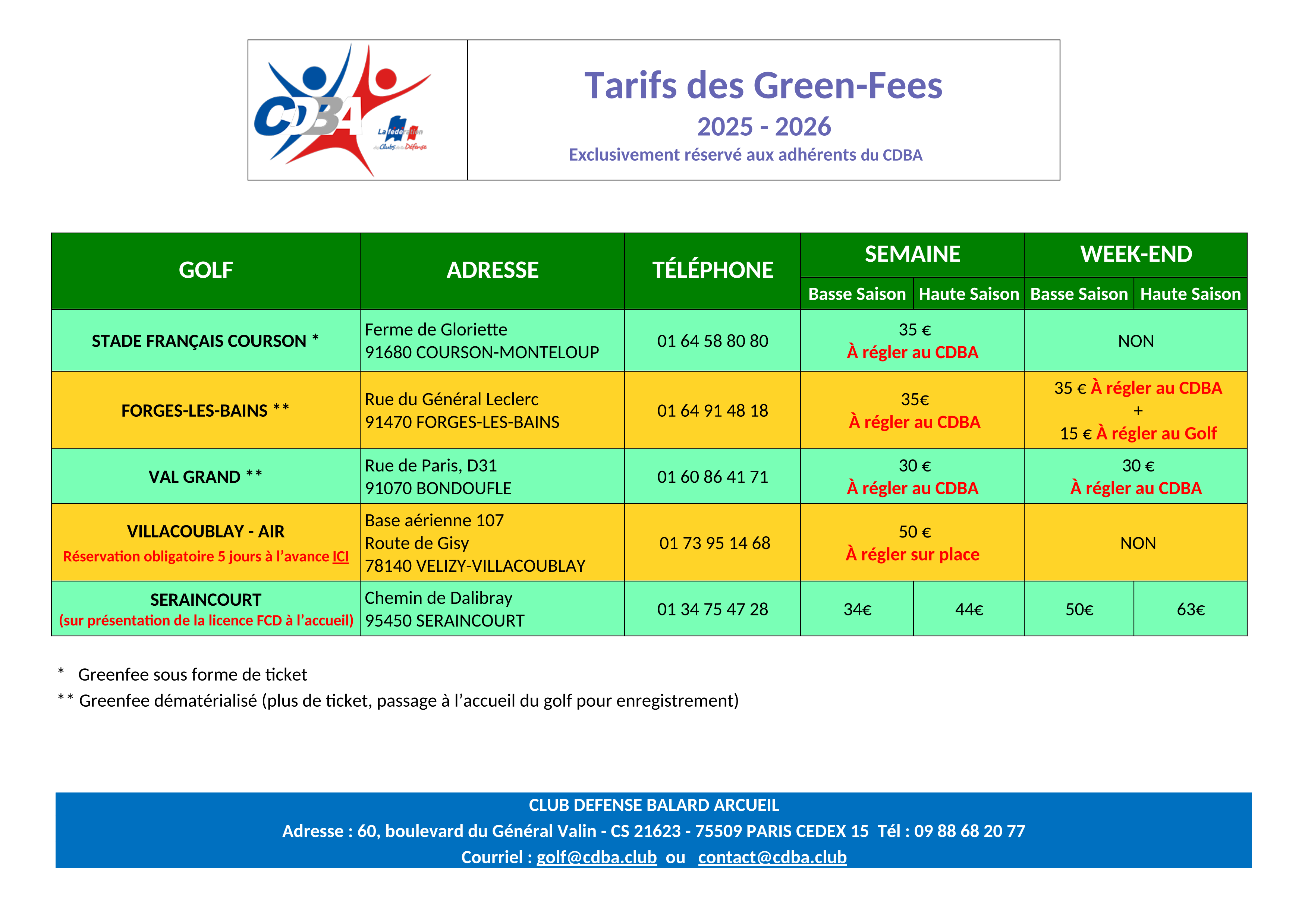 Veuillez envoyer un message au RS de la section golf, M. DUNET Franck sur la boite fonctionnelle ( golf@cdba.club ), en spécifiant votre besoin exact en nombre par golf.Renseignements, dossier inscription, etc., veuillez prendre contact directement avec le RS de la section Golf.