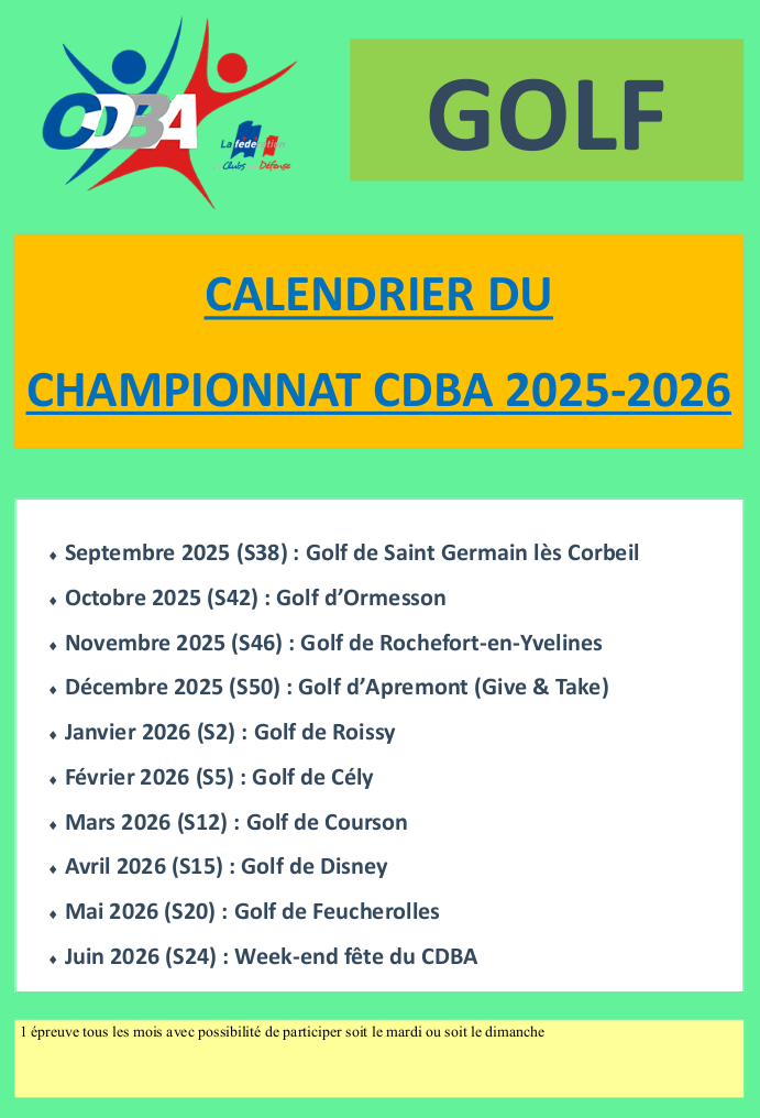 Participation aux compétitions FCD (voir le calendrier FCD ci-dessous).Organisation de compétitions dans les golfs de la région parisienne. (voir le calendrier coupe CDBA ci-dessous)