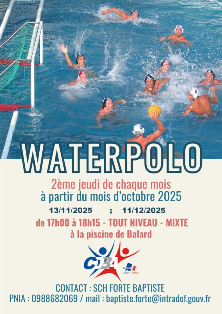 -NOUVEAU , WATERPOLO. 2e jeudi du mois à 17h00, contactez Baptiste FORTE.